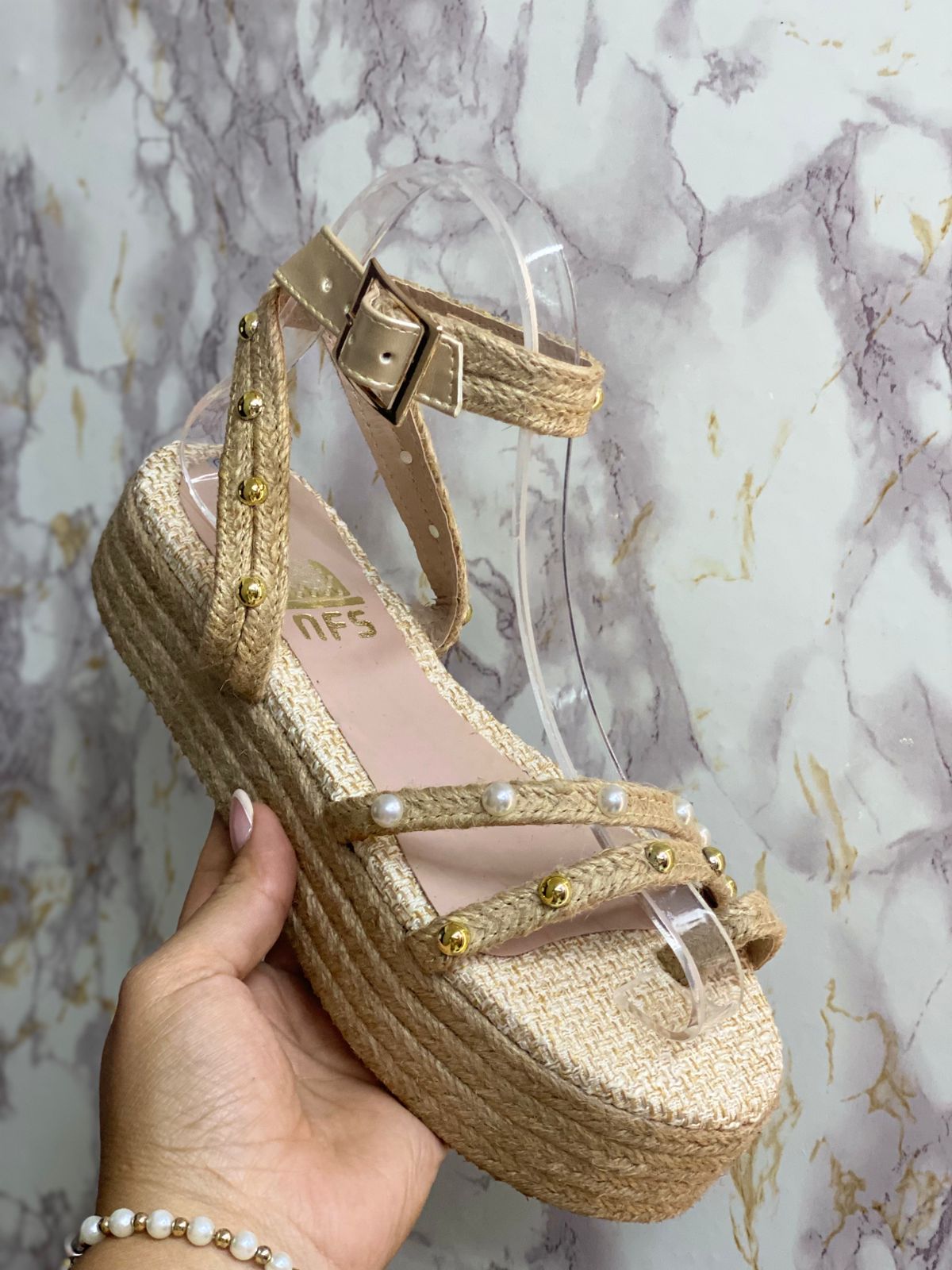 La Plataforma Yute Perlas combina elegancia y comodidad con un diseño sofisticado. Su suela de yute natural ofrece una base resistente y fresca, ideal para el uso prolongado. Los detalles en perlas aportan un toque refinado, perfecto para elevar cualquier look veraniego o casual. Esta plataforma es una opción experta para quienes buscan estilo sin sacrificar confort.
